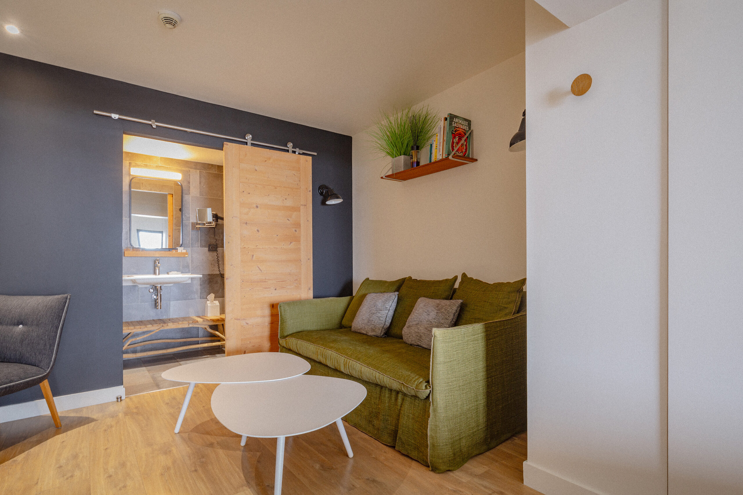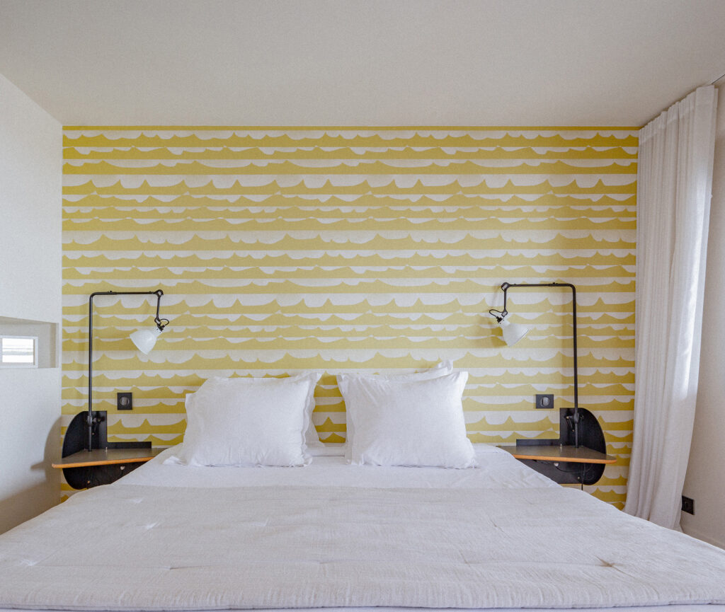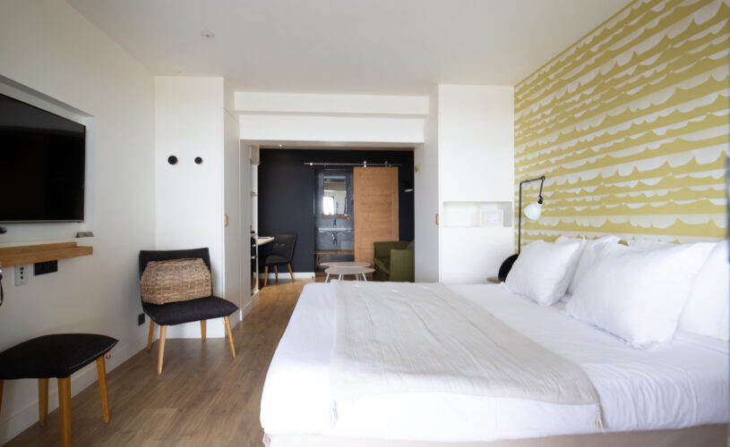Une chambre aquatique à l’image d’un repos mérité à La Plage. Des tissus légers, des luminaires aériens, la terrasse privative vous ouvre sur la nature de La Plage.